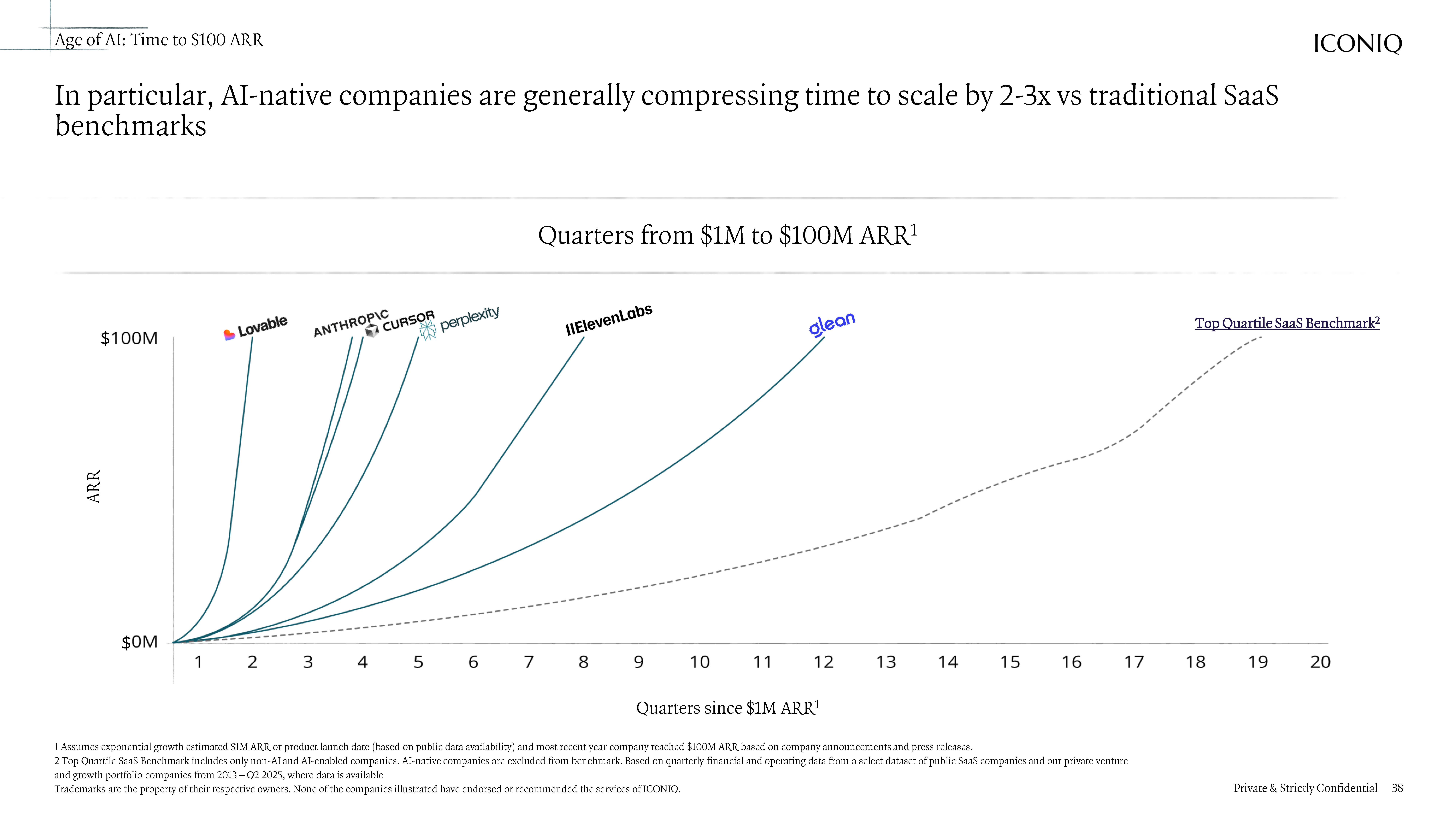 ICONIQが発表したデータによると、従来型SaaSの上位25%企業がARR $1Mから$100Mに到達するまでに約5年を要するのに対し、AIネイティブ企業は驚異的といえる速度でこのマイルストーンを達成しています。Lovableはわずか3ヶ月程度、AnthropicとCursorは9〜12ヶ月でこの成長を実現。従来型SaaSのベンチマークと比較して約2〜19倍のスピードであり、AIがもたらす市場浸透力の強さを物語っています。